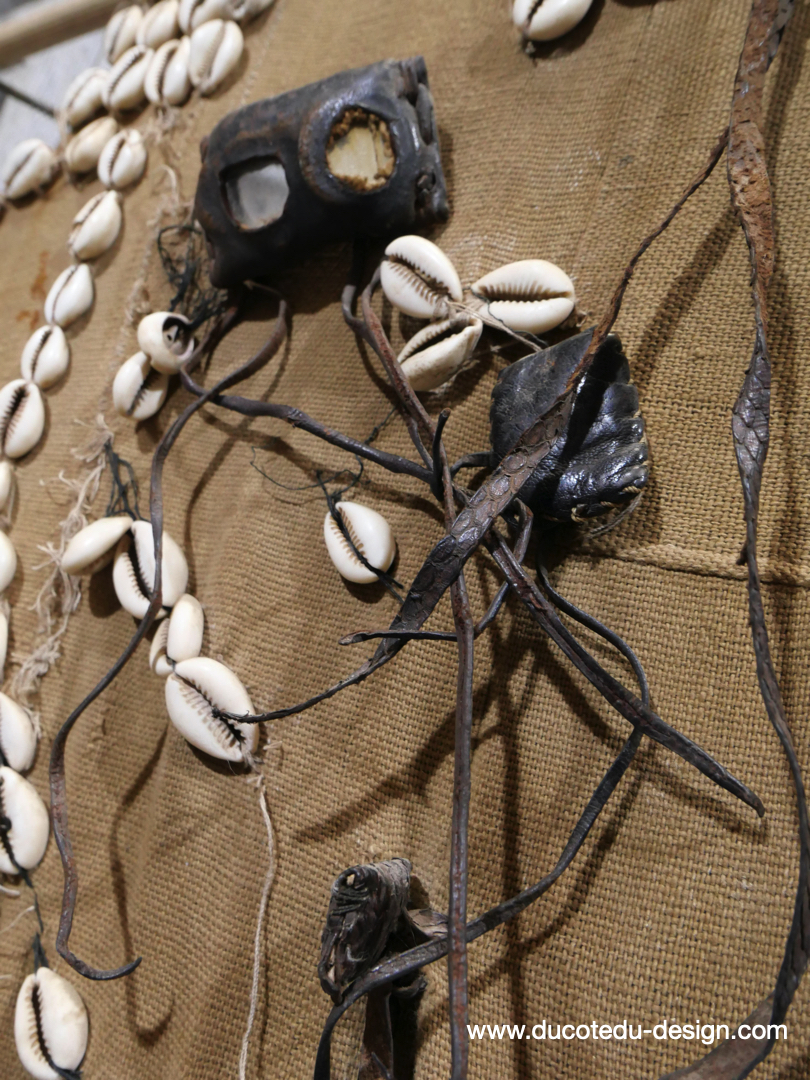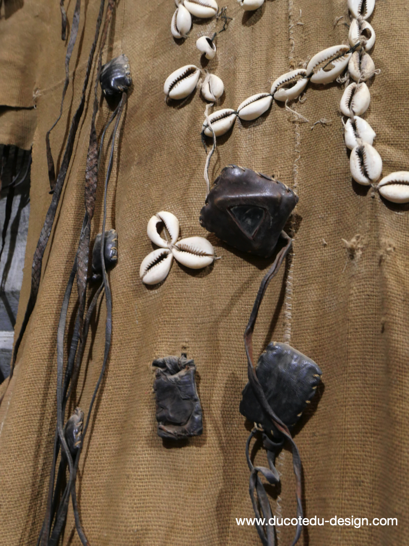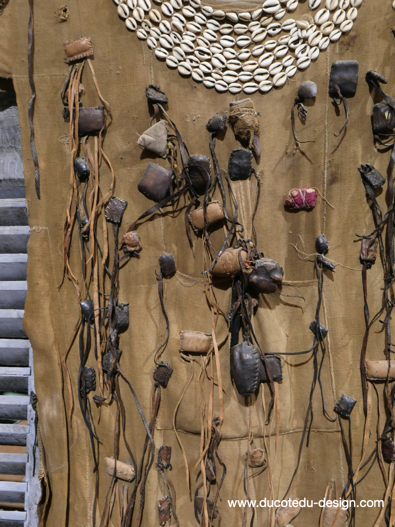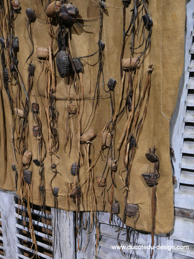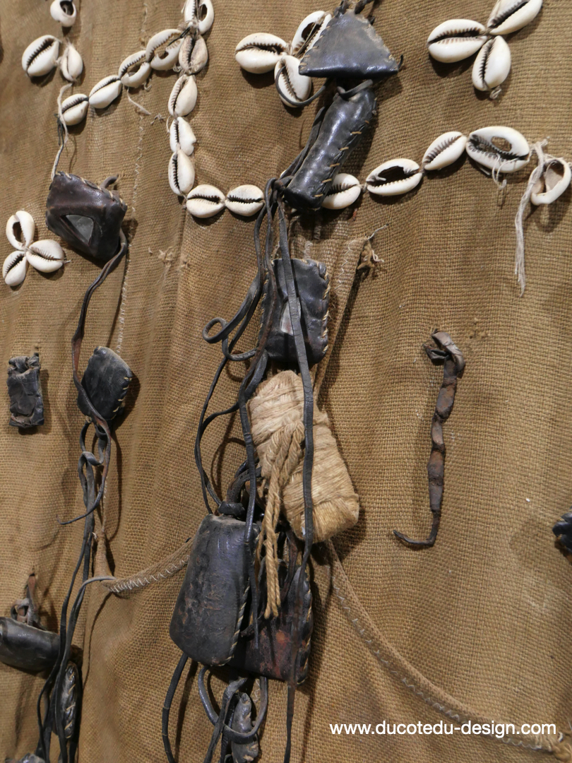 Veste ethnique costume de chasse d'Afrique portant des reliques et des talismans haut 110 cm / larg 158 cm