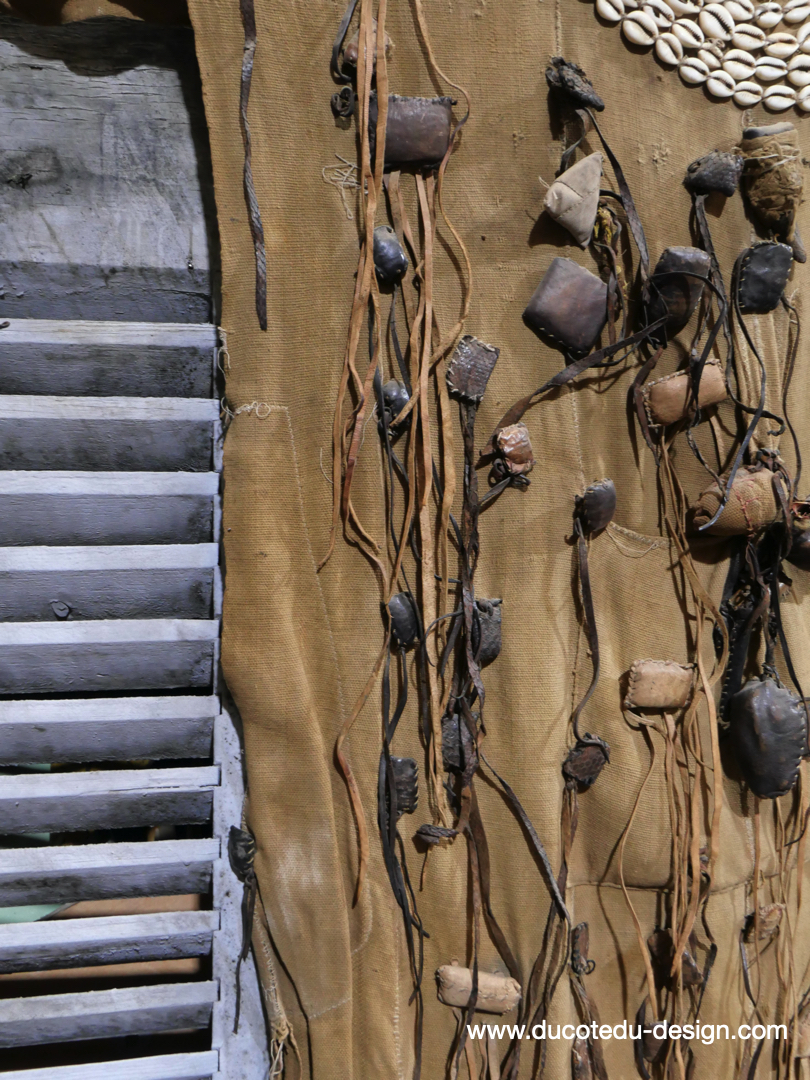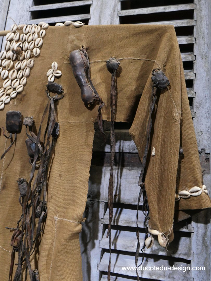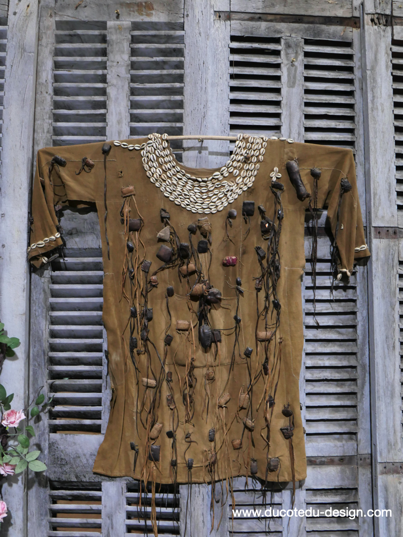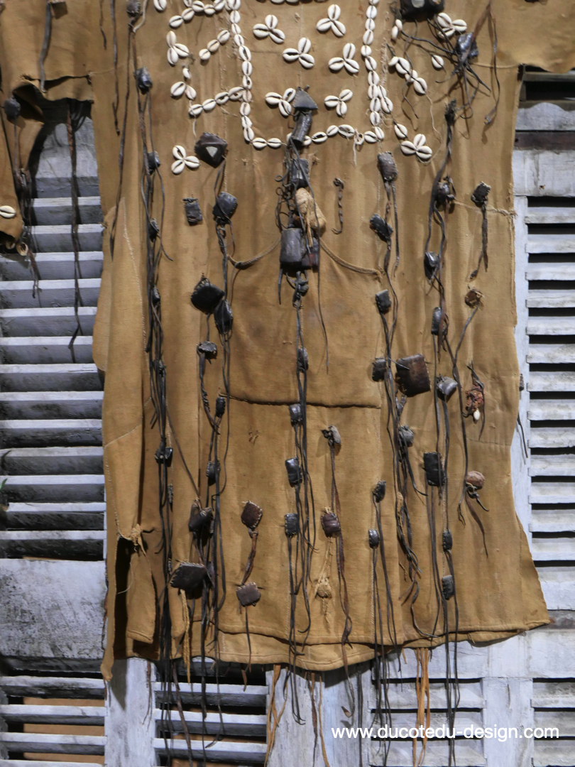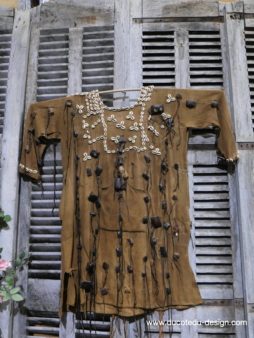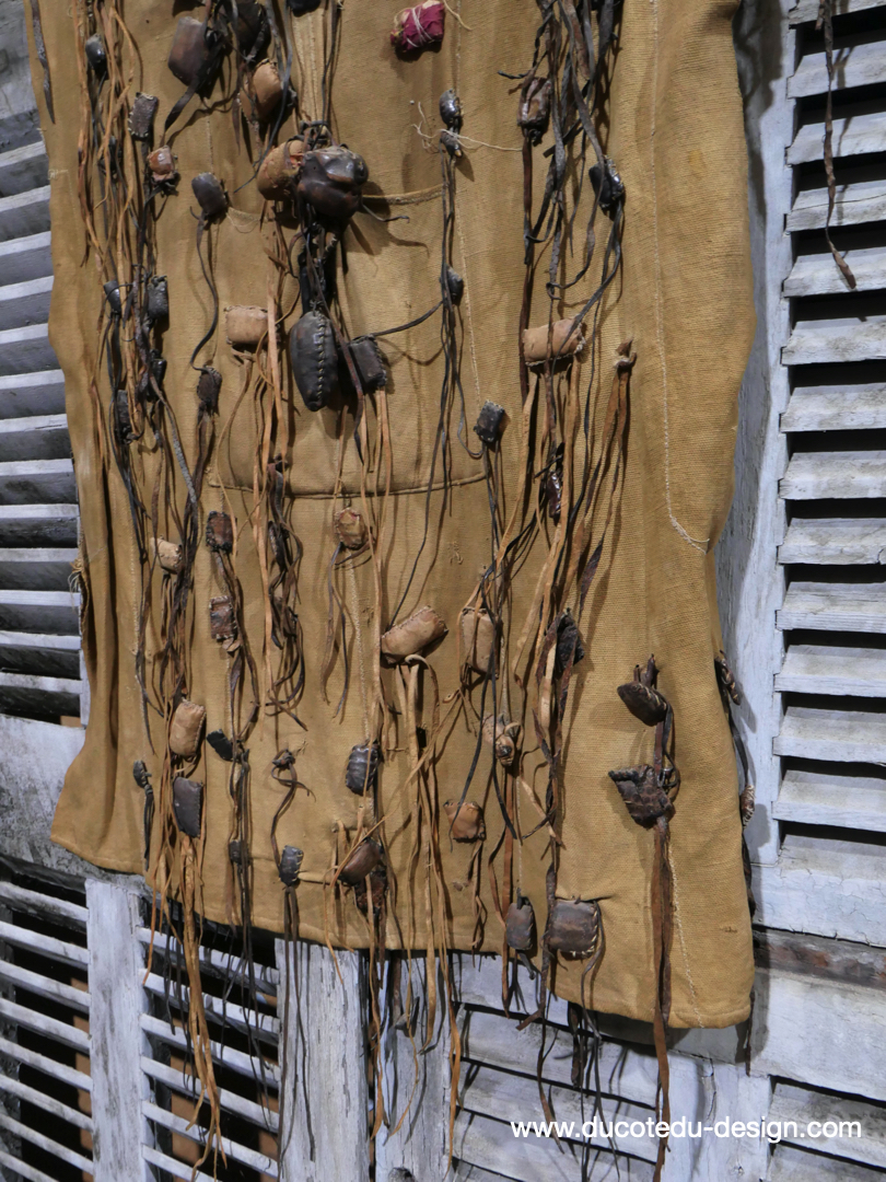 Veste ethnique costume de chasse d'Afrique portant des reliques et des talismans haut 110 cm / larg 158 cm