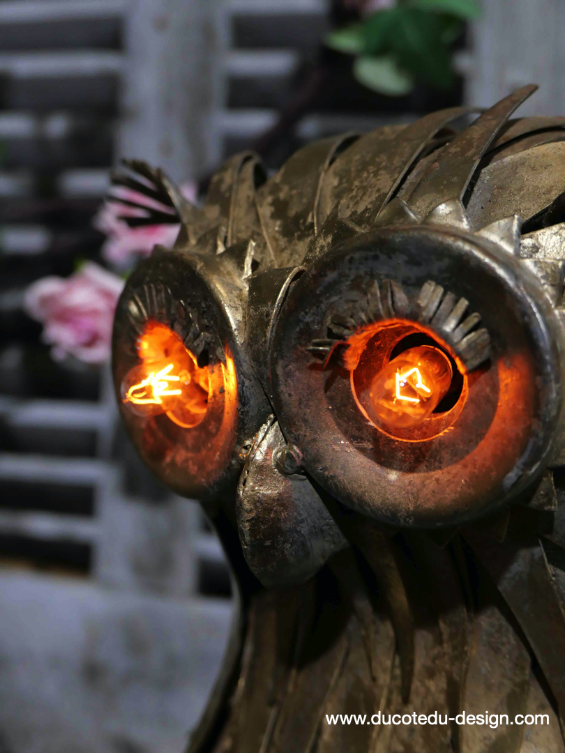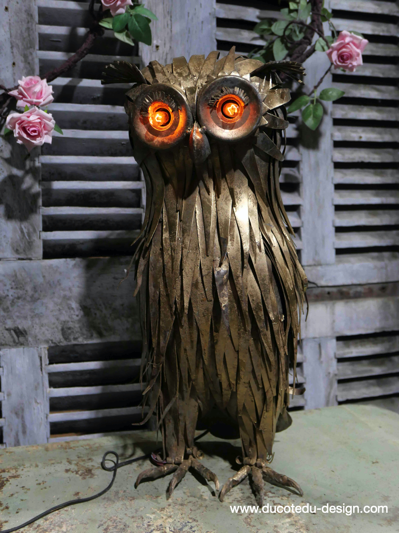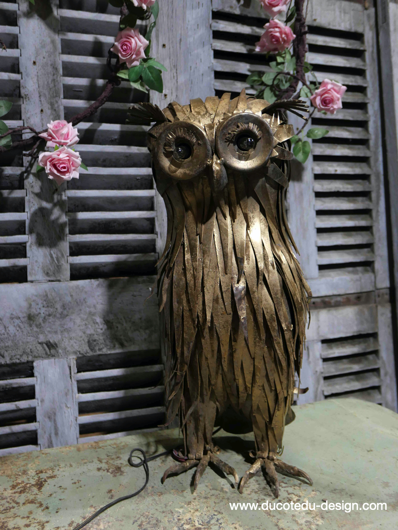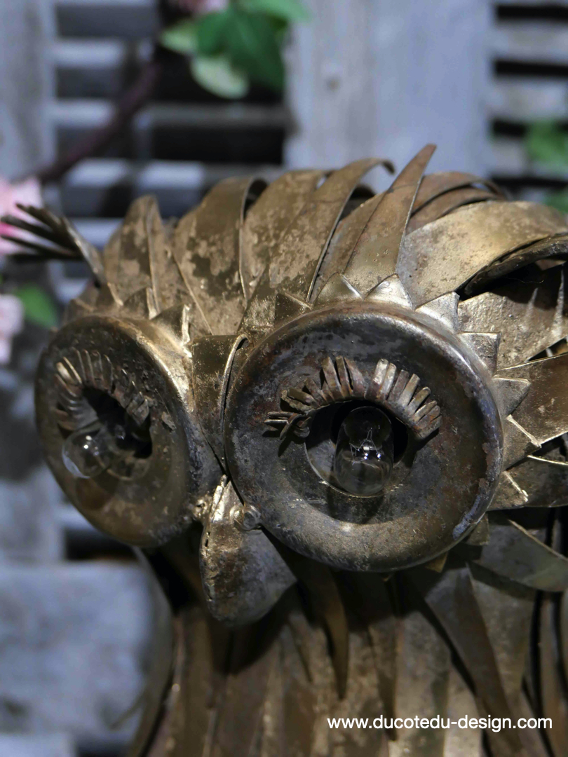 grande chouette en metal yeux lumineux etat d'origine dim 62 / 26 cm