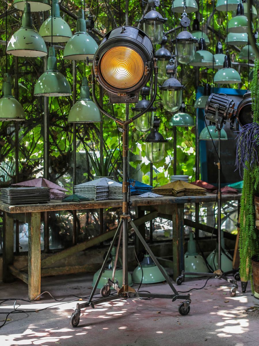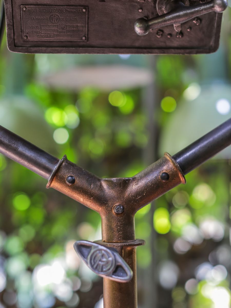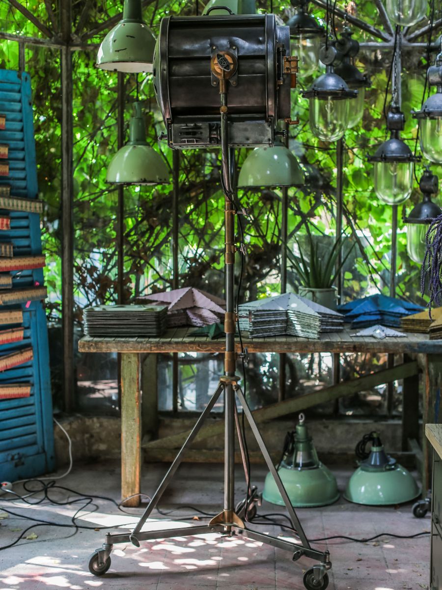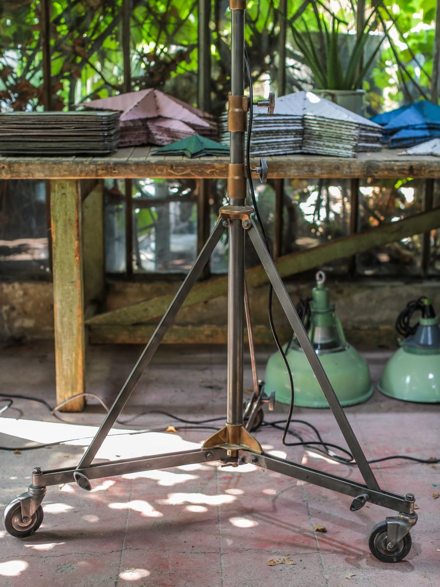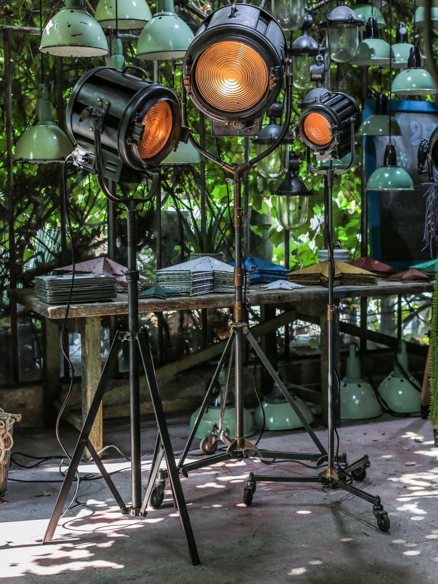 En parfait état de marche ce gros projecteur provenant des studios la victorine a Nice des années 30/40 a l'origine il a une puissance de 5000 watts electricite refaite muni d'une douille e27 standard possibilite de mettre l'ampoule de votre choix fonctionne sur 220 V. très stable grace à son grand pied d'origine a roulettes réglable jusqu'à une hauteur de 3 metres