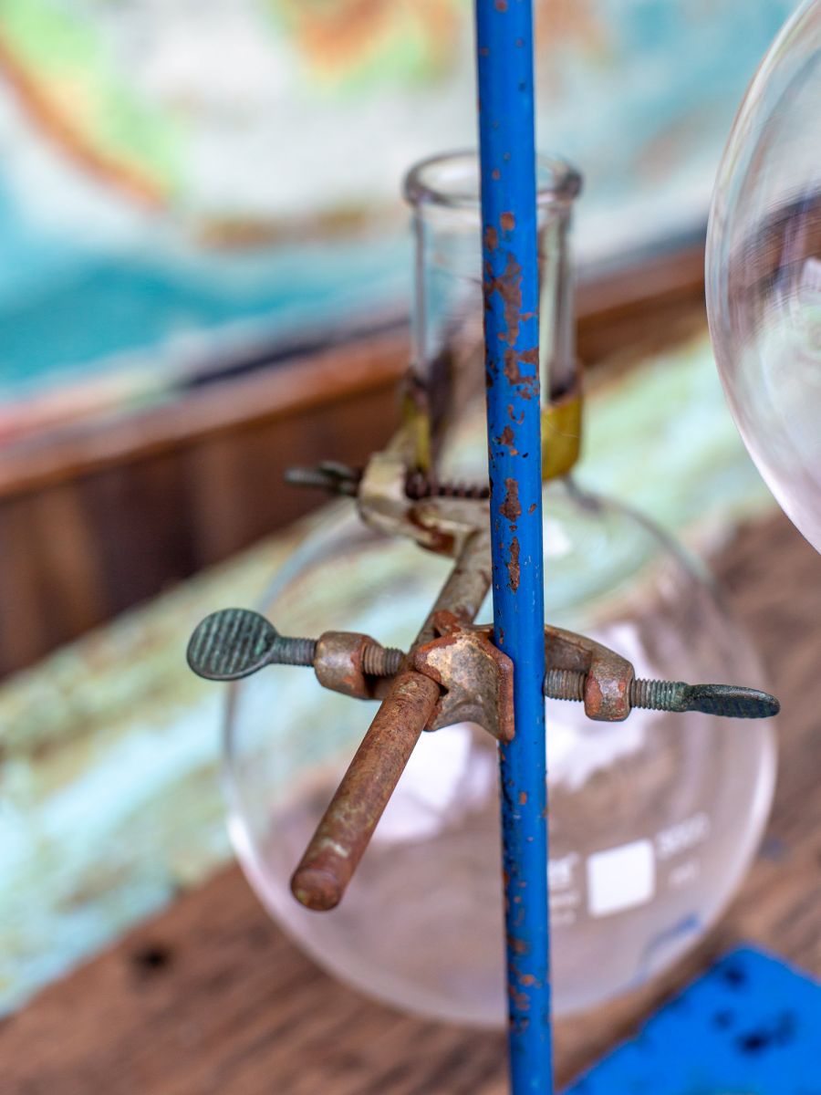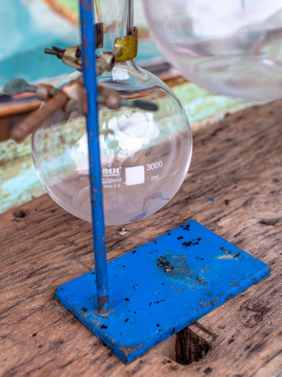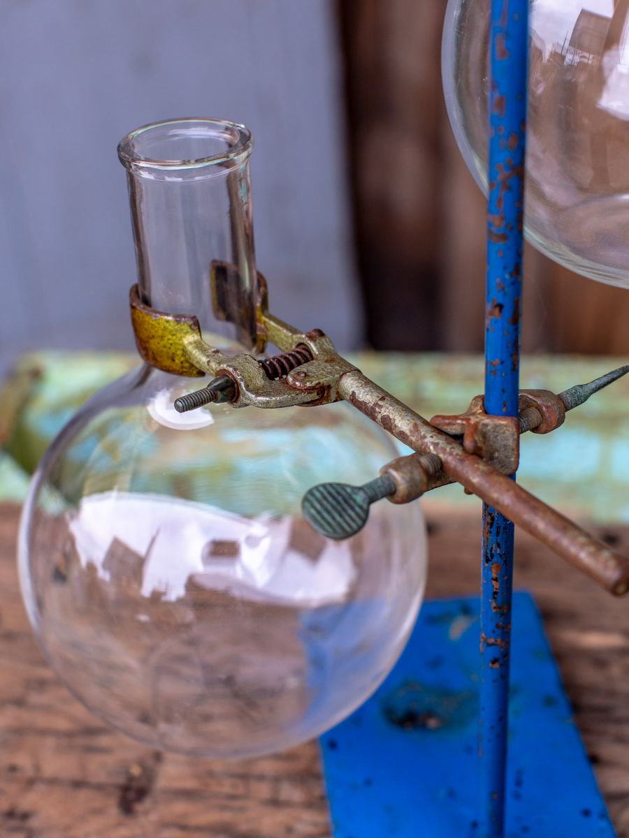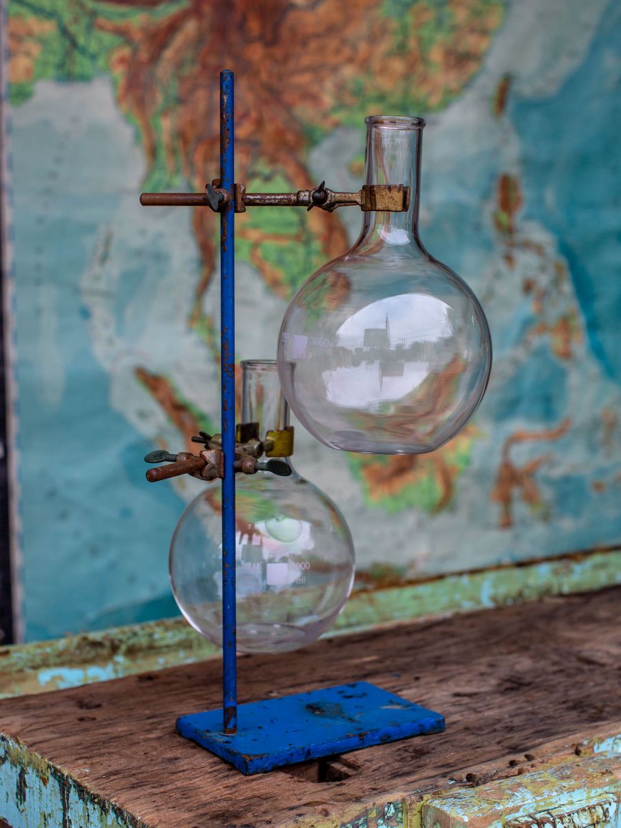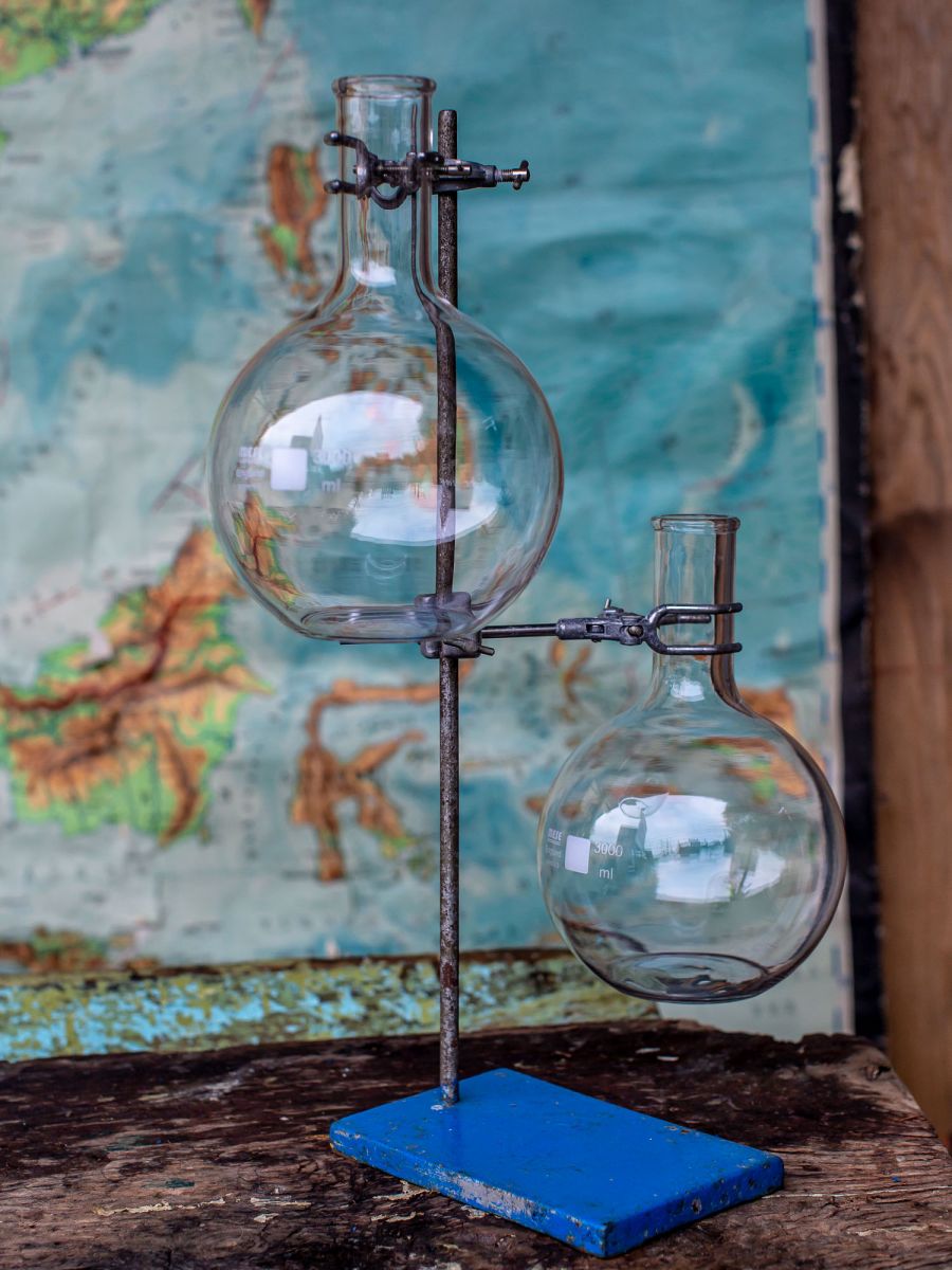 ancien pied de laboratoire double pince 2 grands verres 3 litres dans son jus, belle patine bleue hauteur du pied 63 cm