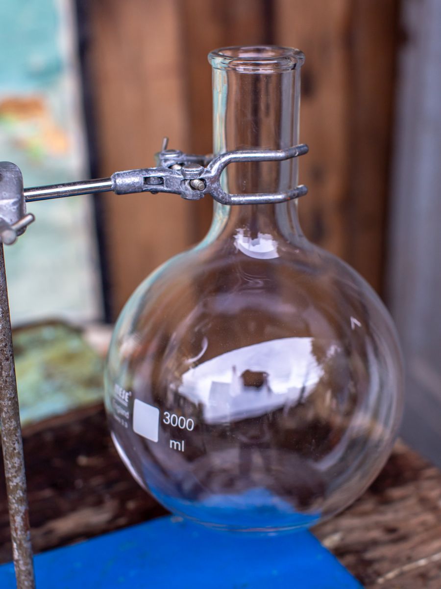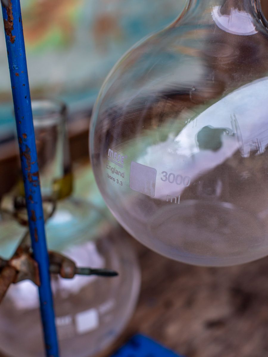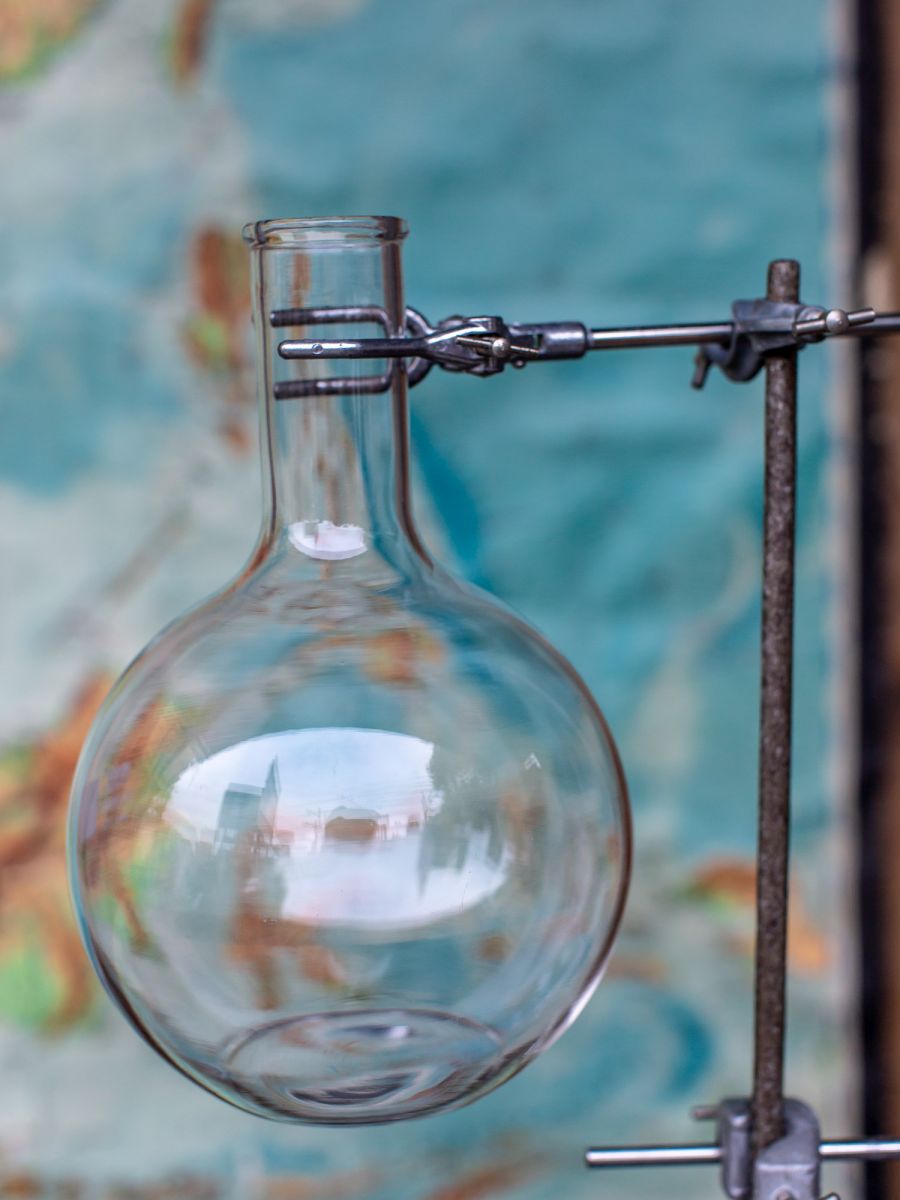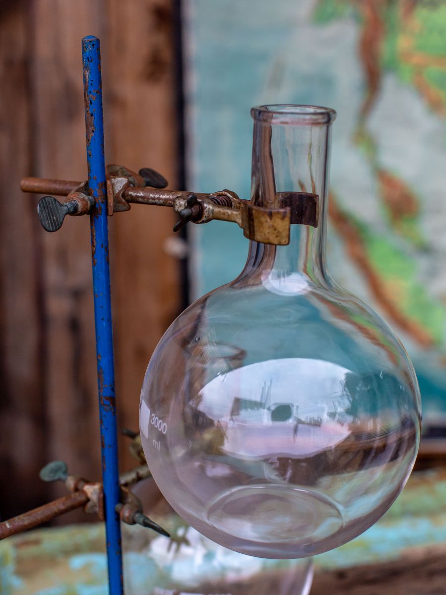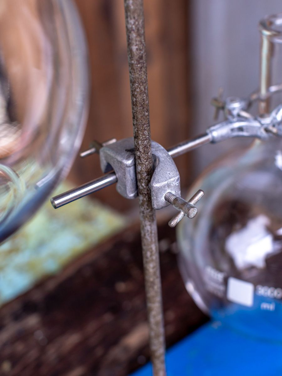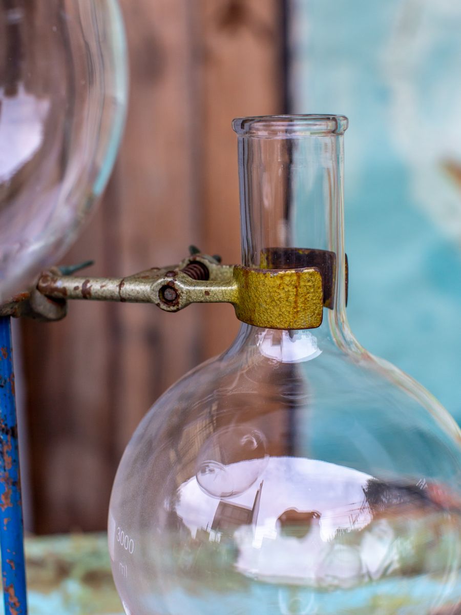 ancien pied de laboratoire double pince 2 grands verres 3 litres dans son jus, belle patine bleue hauteur du pied 63 cm