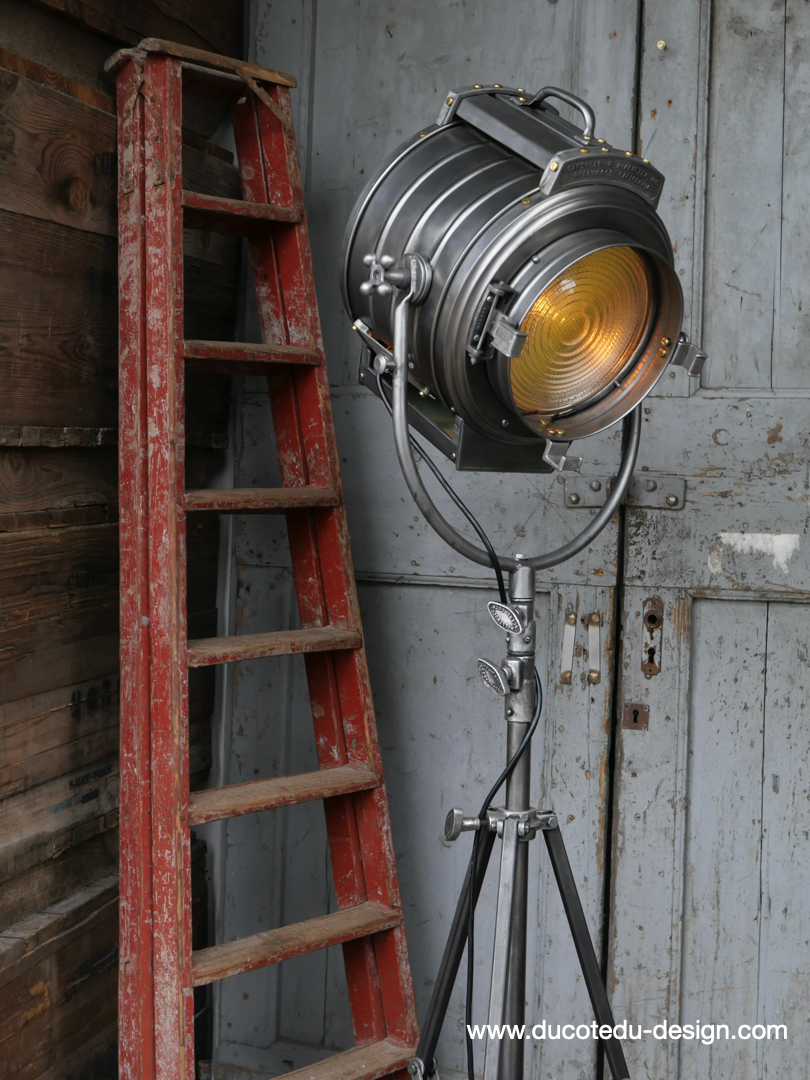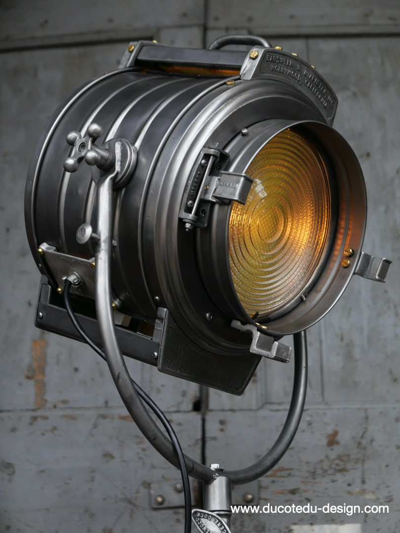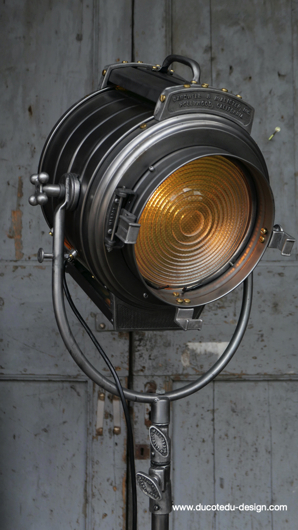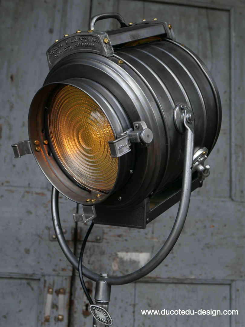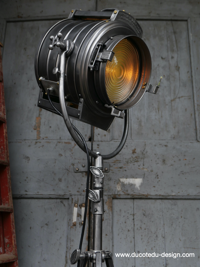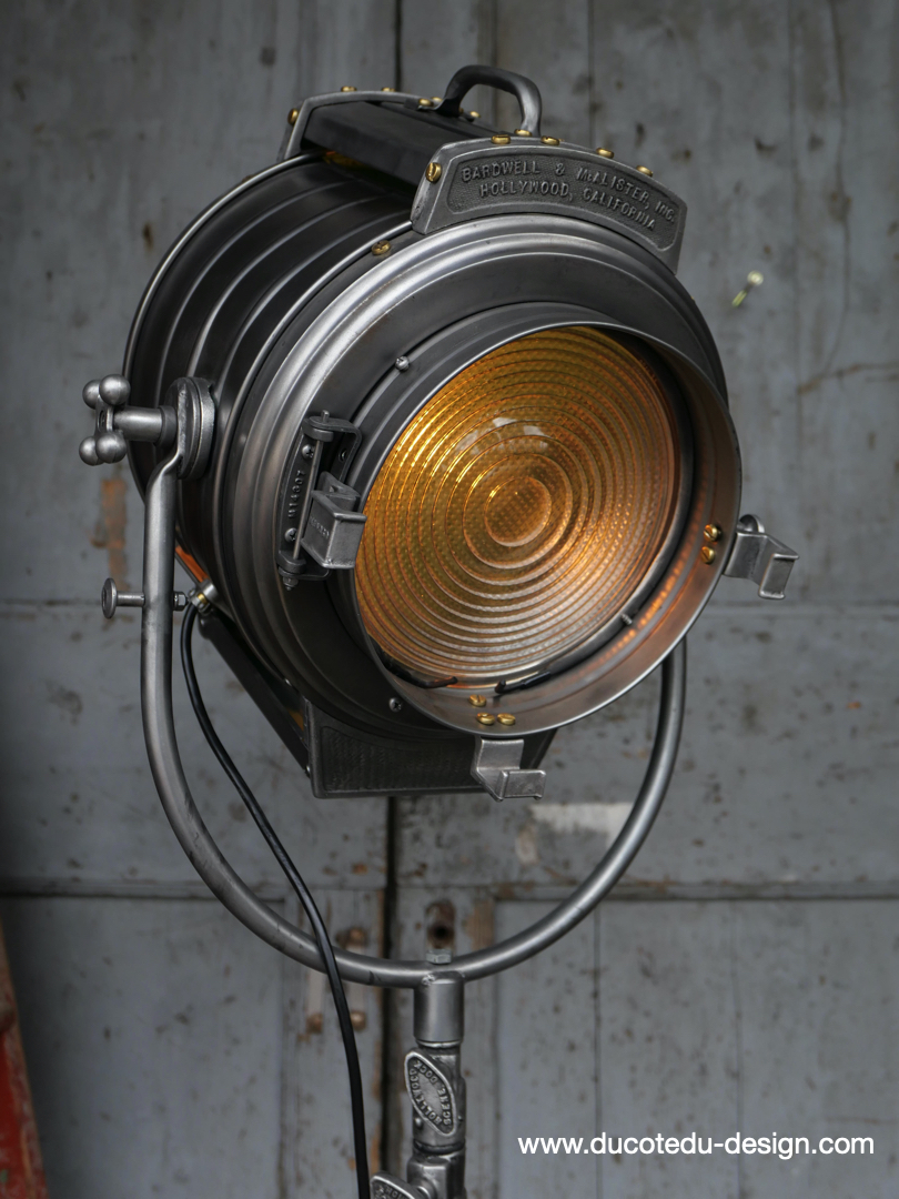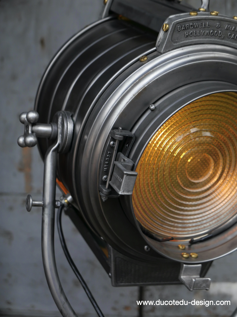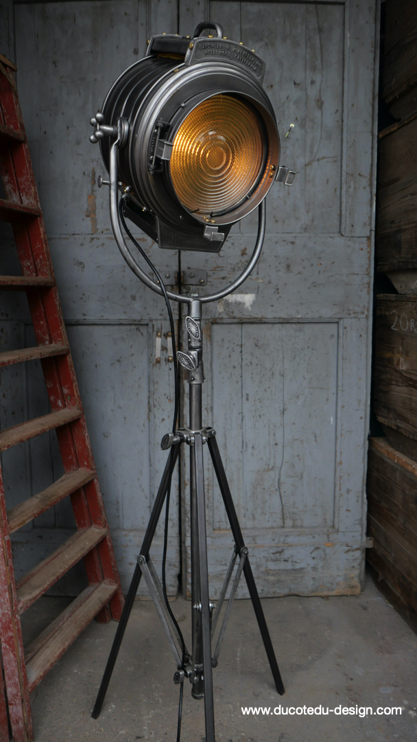 En parfait état de marche ce tres gros projecteur MCALISTER provient des anciens studios Hollywood entierement restauré dans notre atelier muni d'une douille e27 standard équipé d'une lentille de fresnel possibilite de mettre une ampoule de votre choix fonctionne sur 220 V. très stable grace à son gros piétement tripod réglable jusqu'à une hauteur de 2 mètres